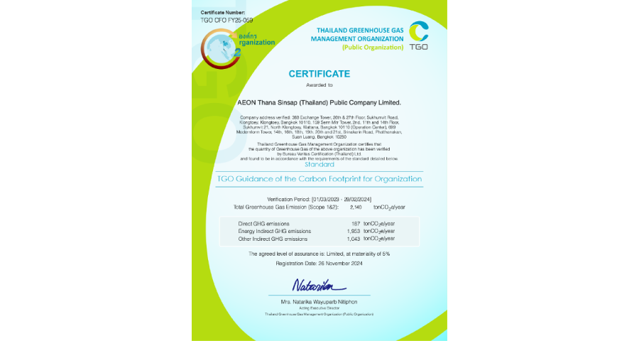 บริษัทเปิดเผยข้อมูลการปล่อยก๊าซเรือนกระจกขอบเขต ที่ 1,2 และ 3 จากผลการดำเนินงานของบริษัท ในปีบัญชี 2566 เป็นปีฐาน โดยข้อมูลดังกล่าวได้รับการทวนสอบจากผู้ทวนสอบภายนอก และได้รับการรับรองและขึ้นทะเบียนการปล่อยก๊าซเรือนกระจกจากองค์การบริหารจัดการก๊าซเรือนกระจก (องค์การมหาชน) หรือ อบก. ในวันที่ 26 พฤศจิกายน 2567 ที่ผ่านมา