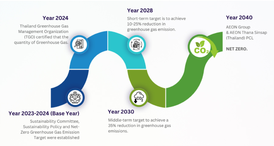 บริษัทยังยึดแนวทางของนโยบายที่เกี่ยวข้อง ได้แก่ เป้าหมายการลดการปล่อยก๊าซเรือนกระจกลงของบริษัท อิออน จำกัด ประเทศญี่ปุ่น 35% ภายในปี พ.ศ. 2573, เป้าหมายการลดการปล่อยก๊าซเรือนกระจก และก๊าซอื่น ๆ ให้เป็นศูนย์ของกลุ่มบริษัท อิออน จำกัด ประเทศญี่ปุ่น ภายในปี พ.ศ. 2583 และบริษัทได้เข้าร่วมเป็นสมาชิกในการจัดการปัญหาก๊าซเรือนกระจกในกลุ่มของ บริษัท อิออน ไฟแนนเชียล เซอร์วิส จำกัด ประเทศญี่ปุ่น เพื่อผลักดันและให้ความร่วมมือในการลดการปล่อยก๊าซเรือนกระจกสู่ชั้นบรรยากาศ ที่เป็นสาเหตุหลักให้เกิดวิกฤตปัญหาโลกร้อน
